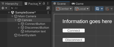 In the Unity project, add a button that users click to connect their wallet and a button that users click to disconnect their wallet. You will add code to these buttons in a later step. You can also use a single button and change its behavior to connect or disconnect based on whether there is a currently connected wallet.